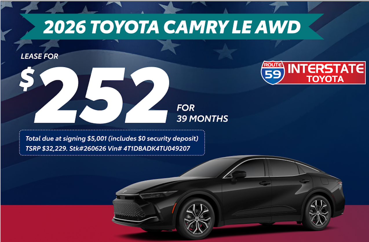 All prices and payments include all costs to be paid by consumer except tax, title, MV fees & $175 doc fees. Total due at signing $5,001 ($3,999 Down + $252 1st Month + $750 Bank Fee + $0 Security Deposit). Residual: $21,271. 10k mi/ year with .10¢ each additional mile. All rebates included in payment. All rebates back to dealer. Lessee responsible for insurance, maintenance, excess wear and excess mileage. Offers based on Tier 1 approval with Toyota Financial Services. Not all qualify. Termination fee may apply. See dealer for details and qualifications. Offer ends 3/2/26.