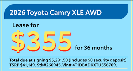 All prices and payments include all costs to be paid by consumer except tax, title, & MV fees. Total due at signing $5,291.50 ($3,999 Down + $355 1st Month + $750 Bank Fee + $0 Security Deposit + $175 doc fee +$12.50 tire fee). Residual: $25,512. 10k mi/ year with .10¢ each additional mile. All rebates included in payment. All rebates back to dealer. Lessee responsible for insurance, maintenance, excess wear and excess mileage. Offers based on Tier 1 approval with Toyota Financial Services. Not all qualify. Termination fee may apply. See dealer for details and qualifications. Offer ends 5/04/26.
