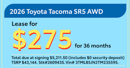 All prices and payments include all costs to be paid by consumer except tax, title, & MV fees. Total due at signing $5,211.50 ($3,999 Down + $275 1st Month + $750 Bank Fee + $0 Security Deposit + $175 doc fee +$12.50 tire fee). Residual: $31,927. 10k mi/ year with .10¢ each additional mile. ?All rebates included in payment. All rebates back to dealer. Lessee responsible for insurance, maintenance, excess wear and excess mileage. Offers based on Tier 1 approval with Toyota Financial Services. Not all qualify. Termination fee may apply. See dealer for details and qualifications. Offer ends 5/04/26.